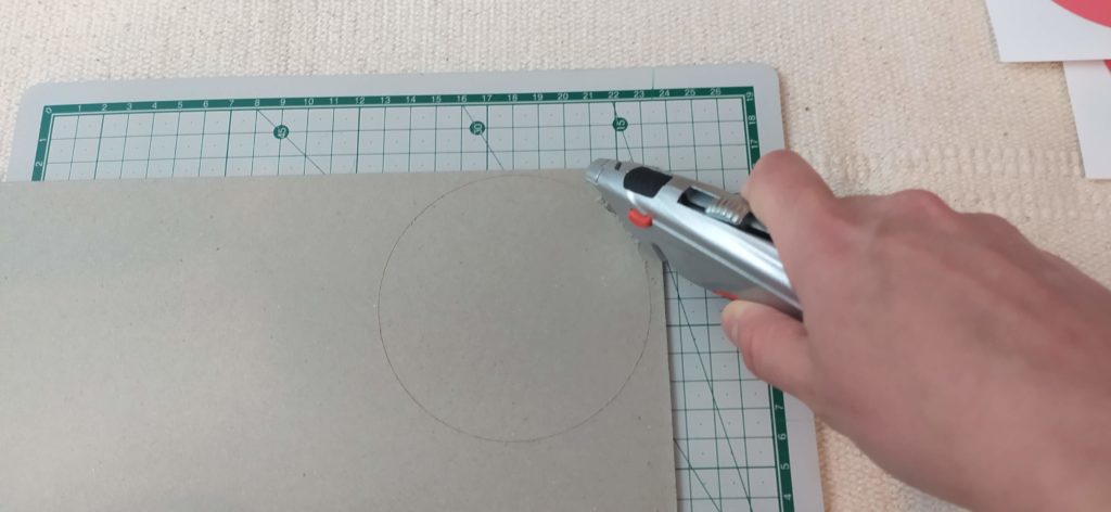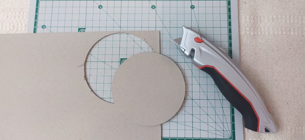 Dopiero mając takie nacięcie, zabieramy się za wycięcie koła nożykiem do kartonu. To już oczywiście trzeba zrobić na podkładce 🙂 Dzięki nacięciu nożyk mniej zjeżdża z zaplanowanej linii, ale mimo wszystko trzeba być uważnym.