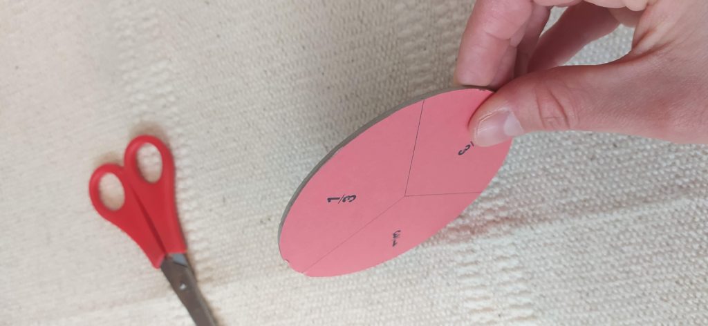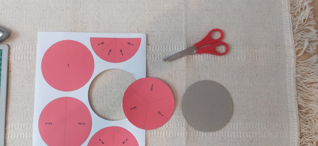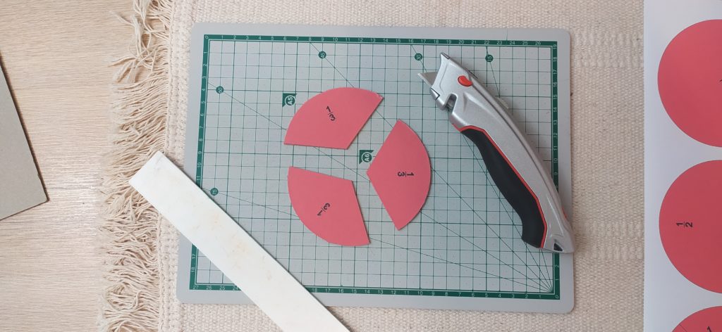 Jeśli chcemy, żeby ułamki były dwustronne, dopiero teraz jest na to pora (wcześniej trudno “zgrać” linie po obu stronach kartonu). Wycinamy wydrukowane ułamki, rozcinamy i naklejamy z drugiej strony. Gotowe! 🙂