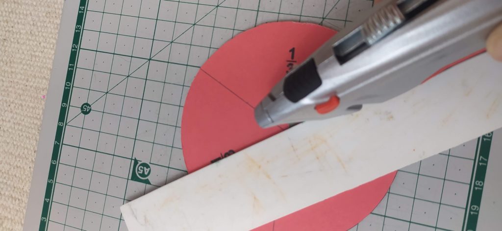 Teraz rozcinamy nożykiem koło na poszczególne elementy wzdłuż linii. Najlepiej zrobić to przykładając linijkę (oczywiście trzymając ją ręką 😉 Mi rąk zabrakło ze względu na robienie zdjęć ;)).