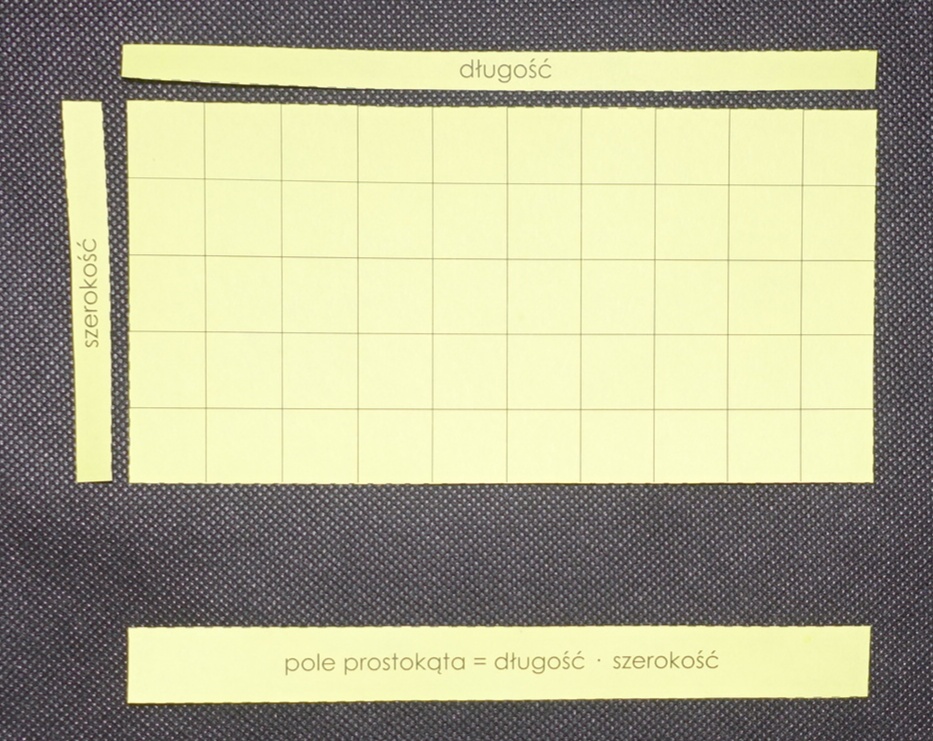 Jeśli dziecko nie pracowało wcześniej z polem prostokąta i równoległoboku, musimy zaprezentować mu prostokąt, pytając o to, jaką ma długość i szerokość (zwykle dzieci naturalnie określają je jako “10 kratek” i “5 kratek”). Następnie tłumaczymy, że będziemy chcieli policzyć pole prostokąta, czyli to, z ilu kratek się składa. Dziecko wybraną przez siebie metodą może policzyć, że jest ich 50. Część od razu zauważa, że jest to wynik mnożenia, a jeśli policzyło kratki “po jednej” lub innym sposobem, możemy mu to pokazać: “mamy 5 rzędów po 10 kratek, więc kratek jest 5 razy 10, czyli 50”. Obok odpowiednich boków umieszczamy podpisy “szerokość” i “długość”, a następnie pokazujemy dziecku zapisany słownie wzór na pole prostokąta: “Pole = szerokość x długość”.
