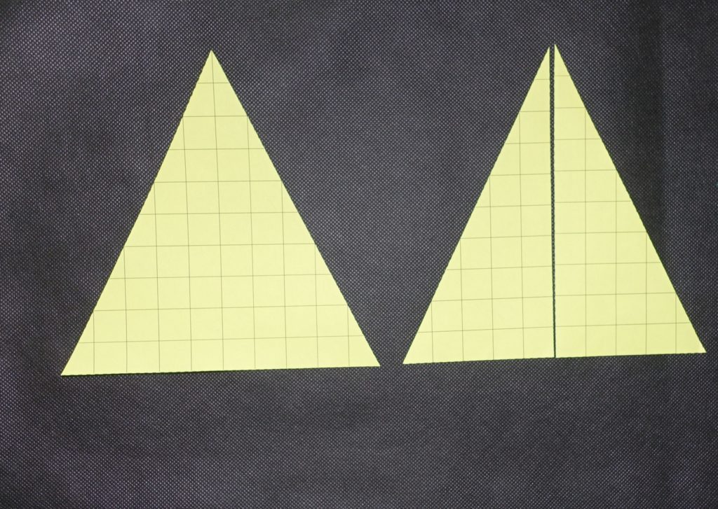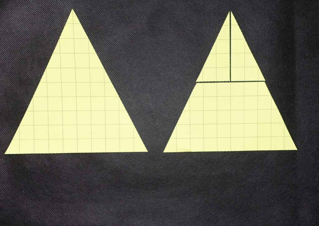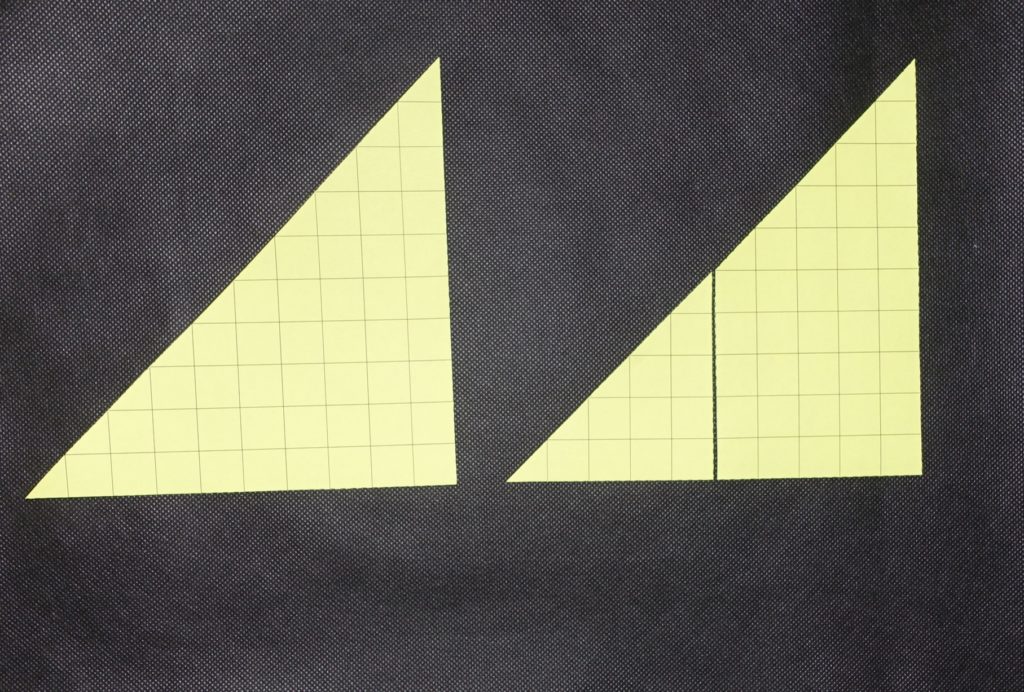 - trójkąt ostrokątny równoramienny o podstawie 10 i wysokości 10 oraz pięć części z których można ułożyć dwa kolejne takie trójkąty,