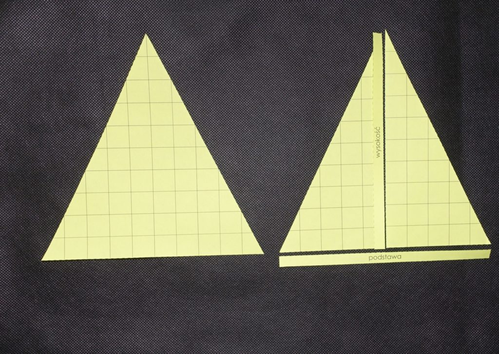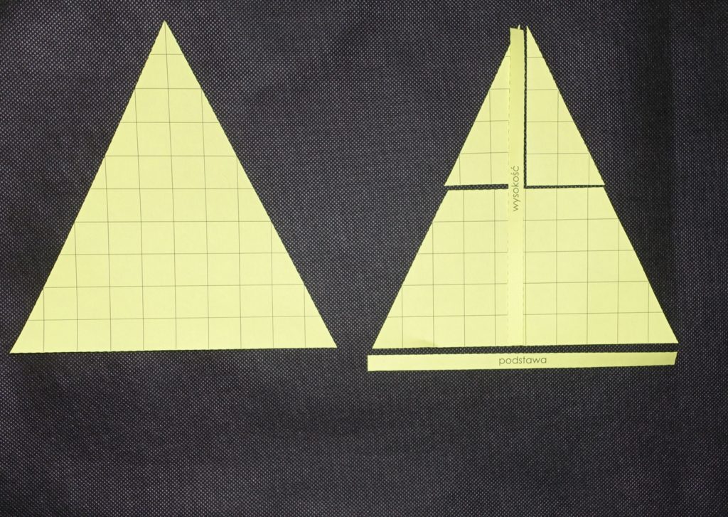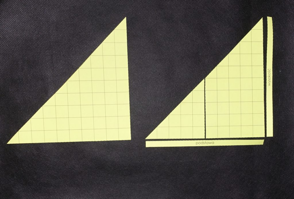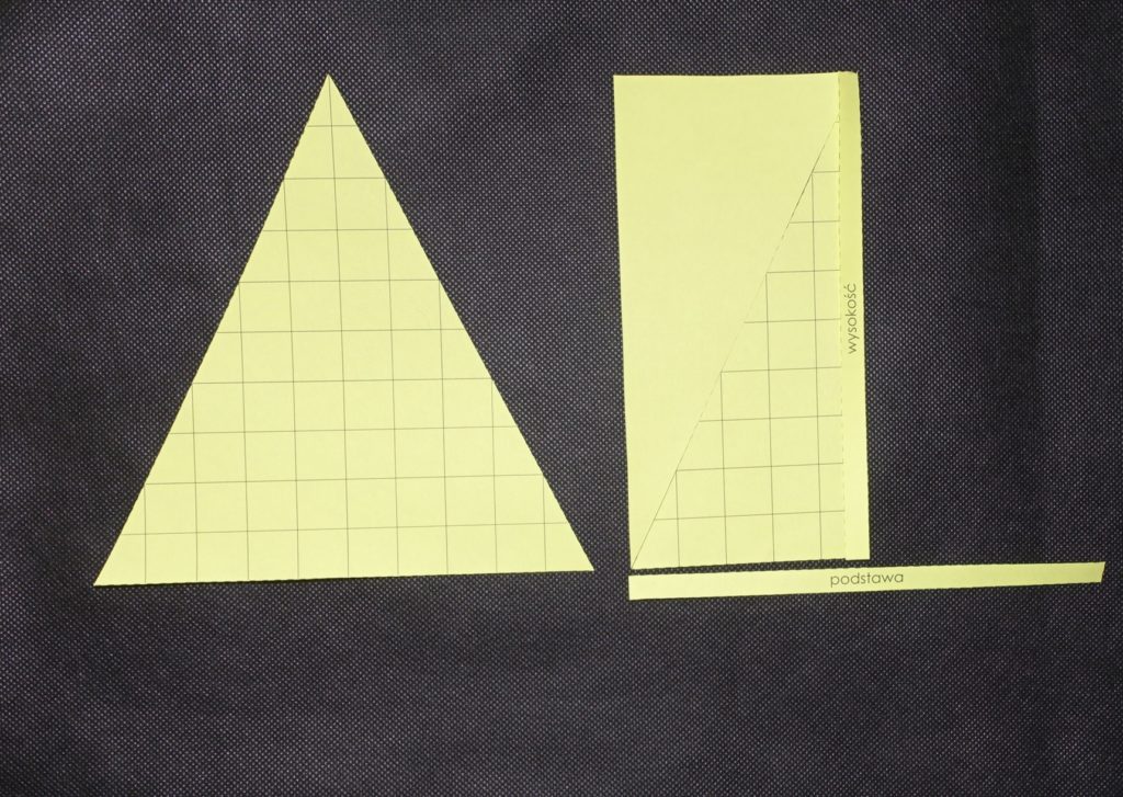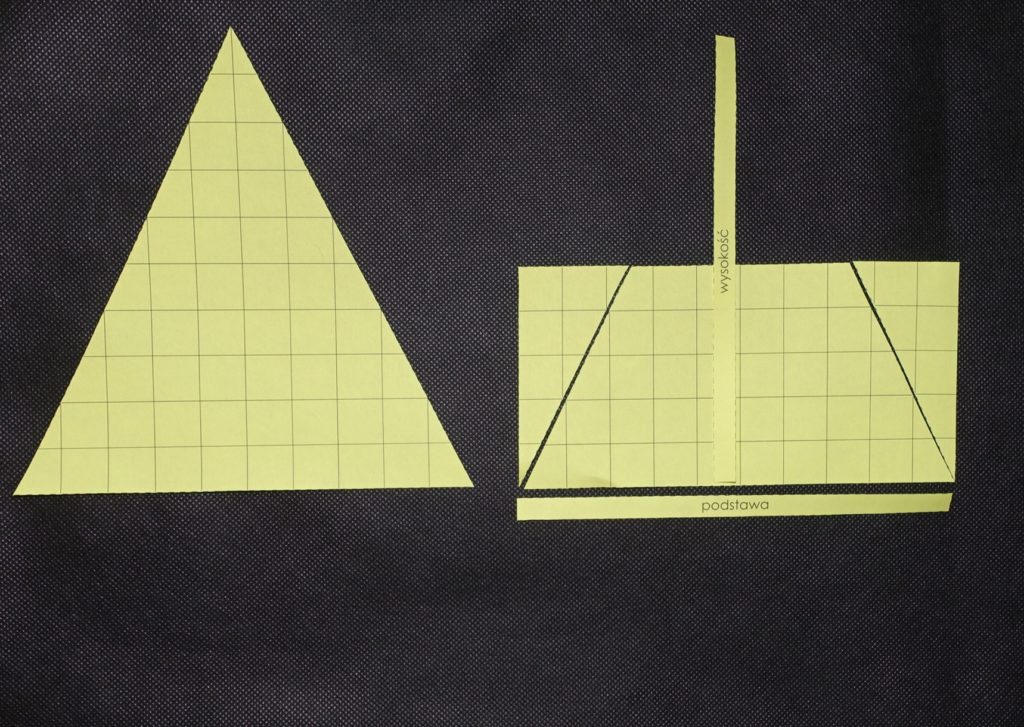 - Prosimy dziecko, by zwróciło uwagę, co dzieje się z podstawą i wysokością trójkąta w czasie przekładania elementów.