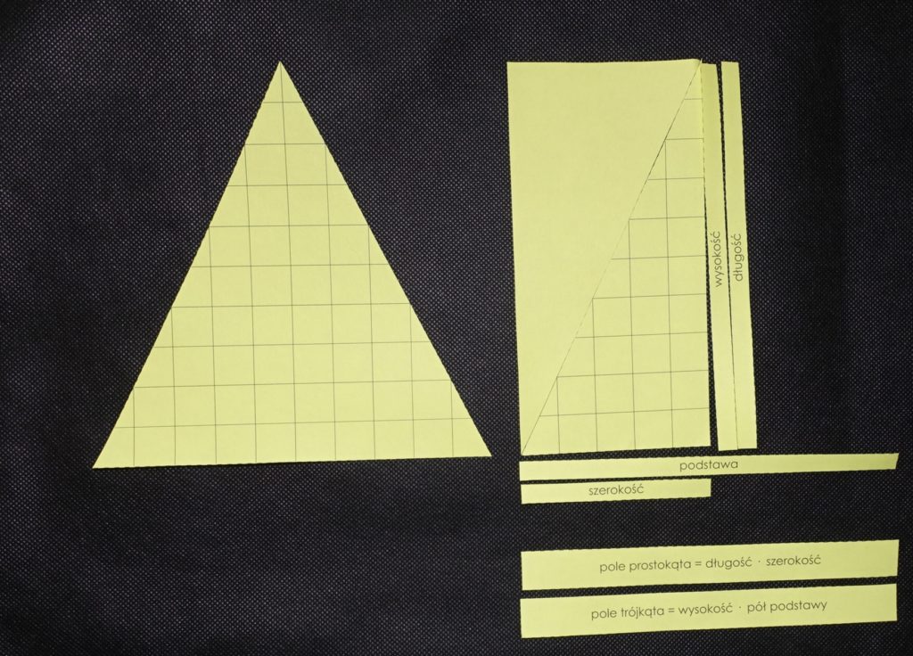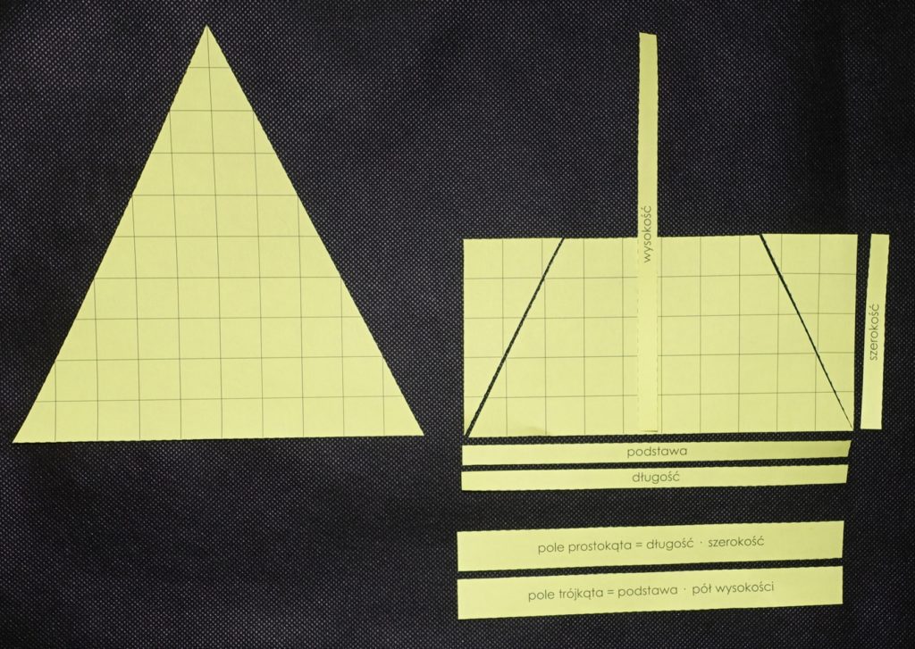 - Mówimy o tym, że pole prostokąta jest takie samo jak pole wyjściowego trójkąta. Przypominamy wzór na pole prostokąta, kładąc odpowiednią kartkę. Następnie mówimy o tym, że jeśli długość zastąpimy podstawą/wysokością trójkąta, a szerokość połową wysokości/podstawy, to otrzymamy wzór na pole naszego wyjściowego trójkąta i kładziemy odpowiednio zapisany wzór.