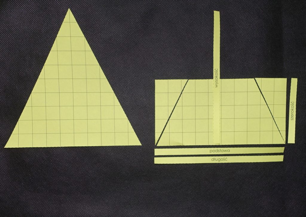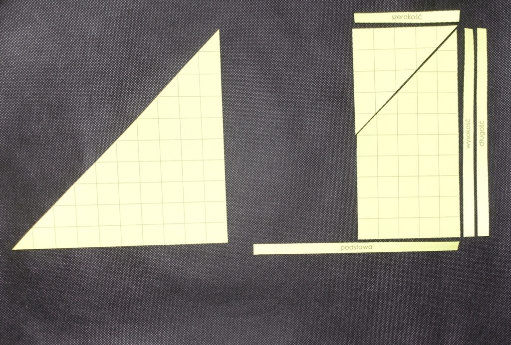 - Wskazujemy szerokość i długość prostokąta i pytamy dziecko o to, jakie są w porównaniu z podstawą i wysokością (zależnie od trójkąta długość prostokąta to podstawa/wysokość trójkąta, a jego szerokość to połowa wysokości/podstawy).