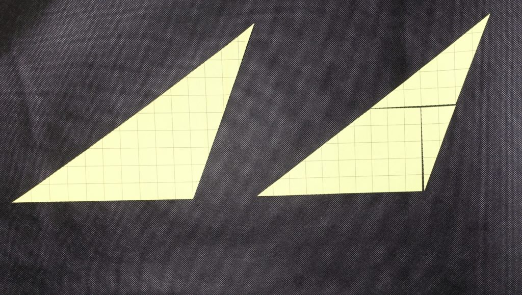 - trójkąt rozwartokątny o jednym z boków przy kącie rozwartym długości 10 i wysokości 10 oraz trzy części do ułożenia jego kopii.