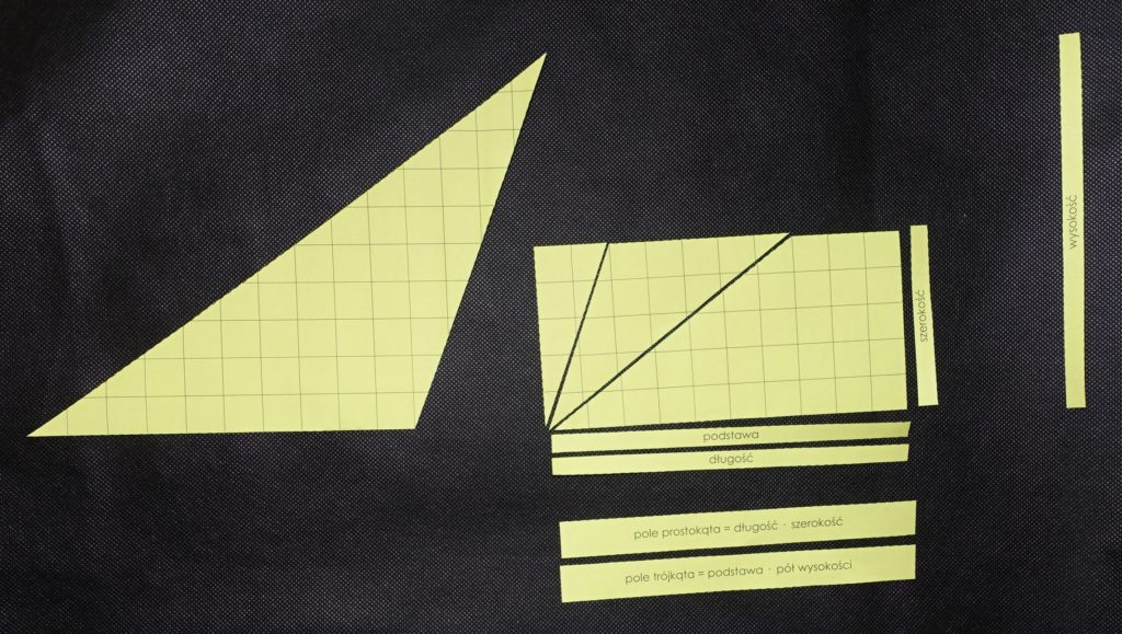 W tym wpisie skupiam się na polu trójkąta, ponieważ istnieje doskonała pomoc opracowana przez Marię Montessori, która umożliwia poznanie wzoru na pole trójkąta. Obejmuje ona również pole równoległoboku, ale brakuje innych czworokątów, dlatego czworokąty (poza prostokątem) opiszę w oddzielnym wpisie z autorskimi rozwiązaniami. Warto rozpocząć prezentację pól od prostokątów, następnie omówić równoległoboki, a później inne figury (romby, trapezy, trójkąty) w dowolnej już kolejności. Jeśli jednak chcemy wykorzystać pomoc w konkretnym celu, nic nie stoi na przeszkodzie, by skorzystać tylko z konkretnego fragmentu pomocy.