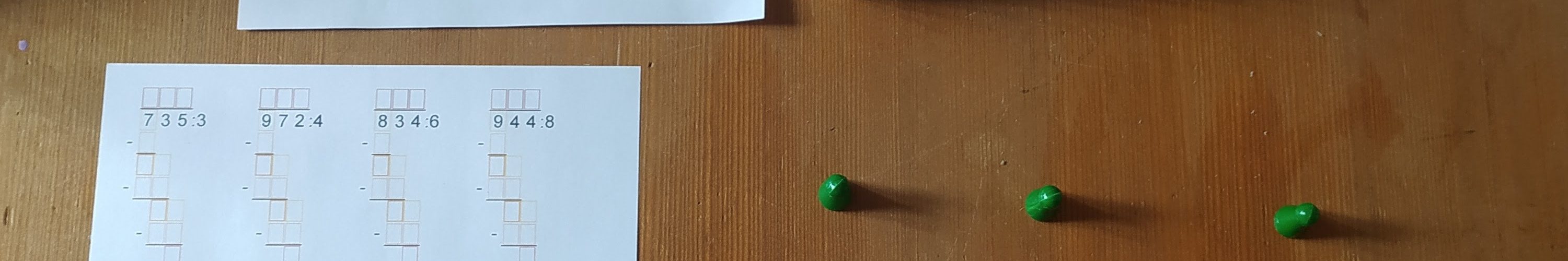 Na sam koniec zostawiłam resztę z dzielenia, która może pojawić się na końcu. To nic strasznego – tak już z dzieleniem jest, że ta reszta czasem zostaje i nie należy się tego bać. W przygotowanych do tej pory bazach nie ma przykładów z resztą. Dzięki temu jej brak jest częściową kontrolą błędu. Ale przykłady, w których wychodzi czasem reszta, bardzo łatwo uzyskać! Po prostu wylosujcie dzielną i dzielnik, na przykład za pomocą kostek 🙂