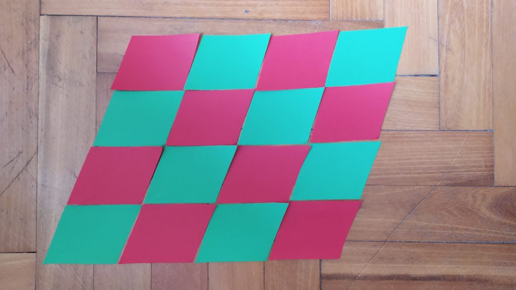Po jakimś czasie dostrzeżemy, że w powstającym parkietażu kafelki mają dwa możliwe położenia (łatwo to zresztą wyjaśnić moim sposobem układania) – ja ułożyłam je z kafelków w dwóch kolorach, żeby było to łatwiej zauważyć.