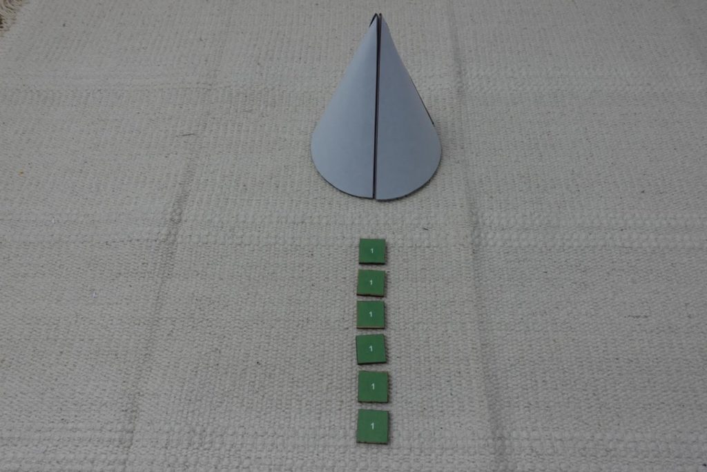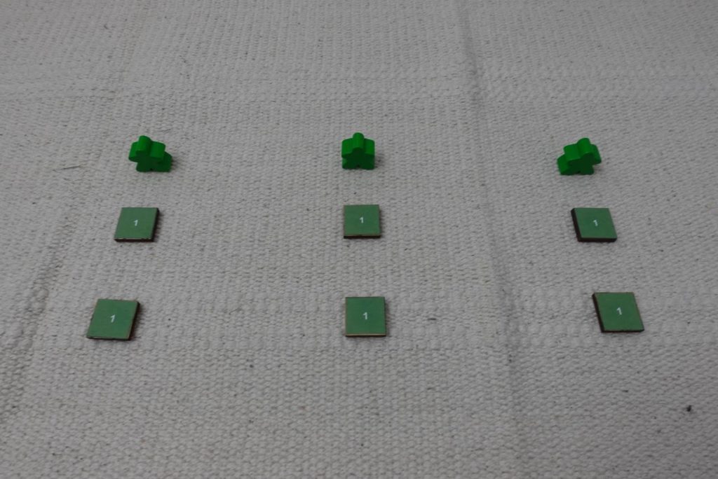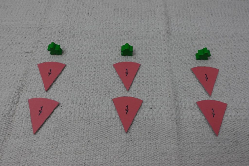 Mnożymy liczbę sześć, więc każdy pionek będzie otrzymywać wartość 6. A ile będziemy mieć pionków? Jedną trzecią! Sięgnijmy więc po kręgiel podzielony na części trzecie. Na początku stawiamy wszystkie części razem, bo wiemy, jaką wartość ma otrzymać cały pionek. Obok kręgla kładziemy wartość sześć. W następnym kroku rozdzielamy kręgiel na części, każdą ustawiając oddzielnie, i jednocześnie rozdzielamy sześć (każda część pionka otrzyma dwa). Pora na odczytanie wyniku – mnożymy przez 1/3, więc wynikiem jest wartość, jaką otrzymała jedna trzecia pionka. Teraz już wiemy, że jest to 2 🙂