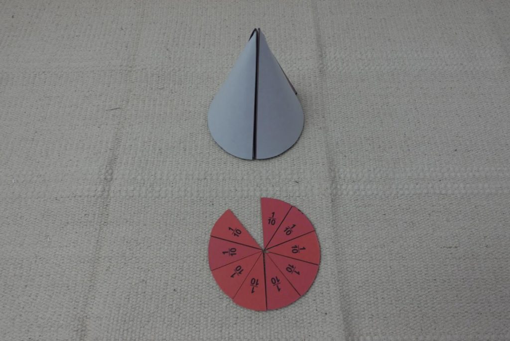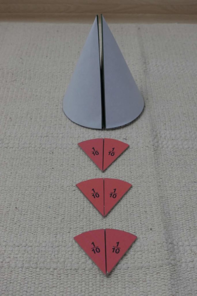 Mnożymy liczbę dziewięć dziesiątych, więc każdy pionek będzie otrzymywać właśnie taką wartość. A ile będziemy mieć pionków? Jedną trzecią! Bierzemy cały kręgiel podzielony na części trzecie i obok niego kładziemy wartość 9/10. W następnym kroku rozdzielamy kręgiel na części, każdą ustawiając oddzielnie, i jednocześnie rozdzielamy 9/10 (każda część pionka otrzyma trzy części dziesiąte). Pora na odczytanie wyniku – mnożymy przez 1/3, więc wynikiem jest wartość, jaką otrzymała jedna trzecia pionka. Teraz już wiemy, że jest to 3/10 🙂