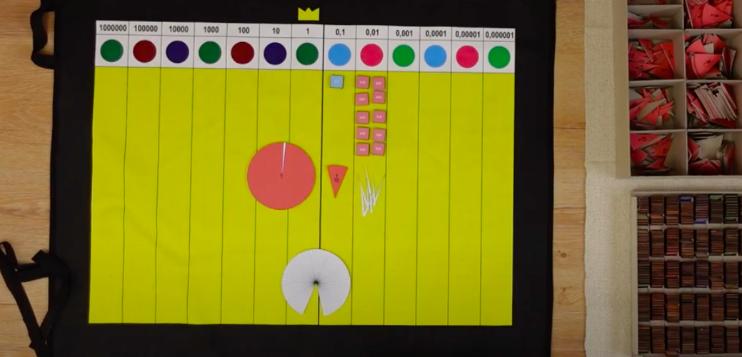 Może jednak jest tak, że razem z tych malutkich części możemy uzbierać całkiem pokaźną liczbę? Przekonamy się o tym przy zmodyfikowanej “grze w dziewięć” zaproponowanej przez samą Marię Montessori. Najlepiej wykonywać ją, gdy dziecko umie już nazywać ułamki dziesiętne i ma świadomość, że na każdym miejscu może być najwyżej dziewięć znaczków.